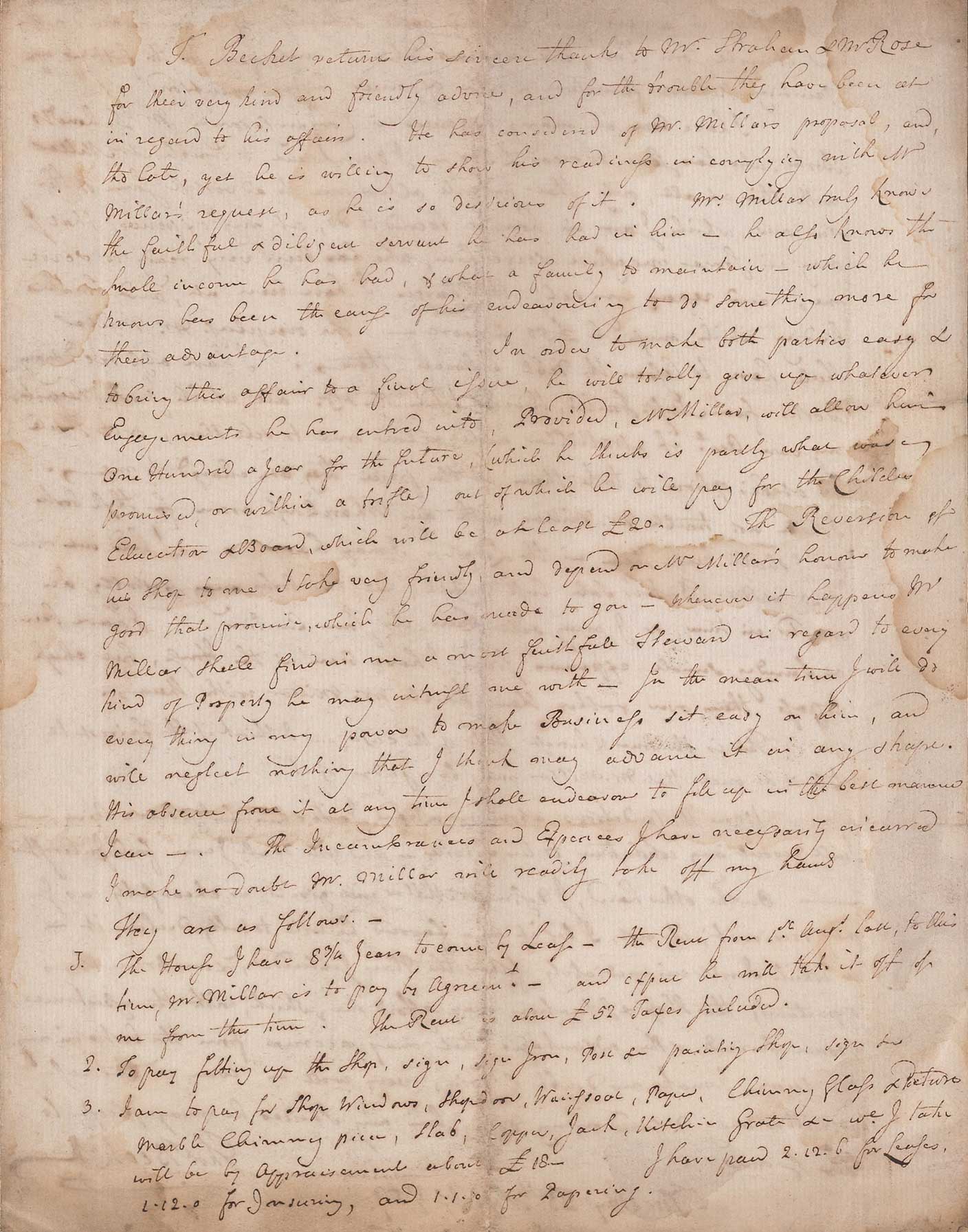 In order to make both parties easy & to bring this affair to a final issue,[7] he will totally give up whatever Engagements he has entered into, Provided, Mr Millar, will allow him One Hundred a year for the future, (which he thinks is partly what was promised, or within a trifle) out of which he will pay for the Childrens Education & Board, which will be at least £20.[8] The Reversion of his Shop to me[9] I take very friendly, and depend on Mr Millar’s honour to make good that promise,[10] which he has made to you – whenever it happens Mr Millar shall find in me a most faithfull Steward in regard to every kind of Property he may intrust me with[11] – In the mean time I will do every thing in my power to make Business sit easy on him, and will neglect nothing that I think may advance it in any shape. His absence from it at any time I shall endeavour to fill up in the best manner I can –. The Incumbrances and Expences I have necessarily incurred[12] I make no doubt Mr Millar will readily take off my hands