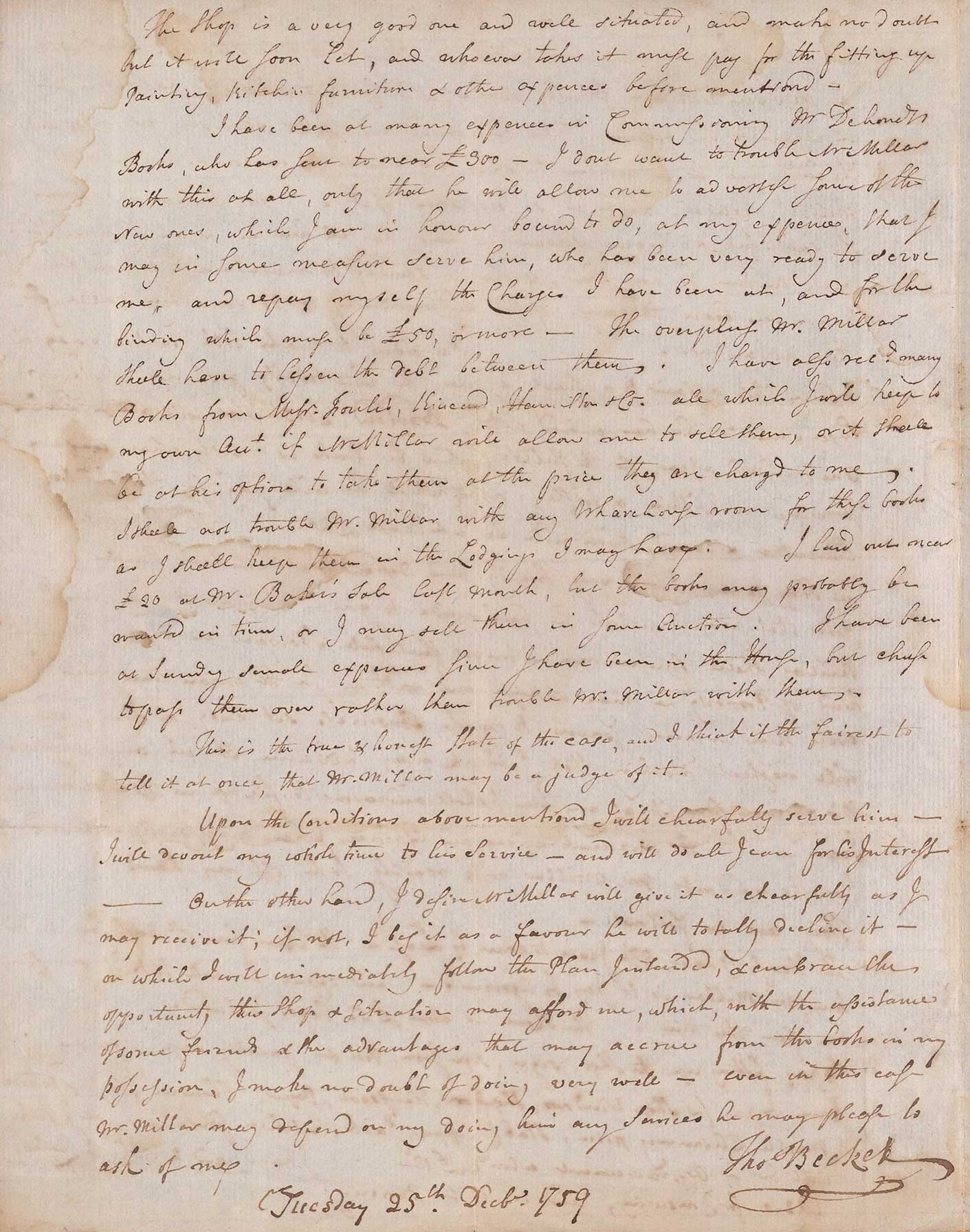 T. Becket returns his sincere thanks to Mr Strahan & Mr Rose[1] for their very kind and friendly advice, and for the trouble they have been at in regard to his affairs.[2] He has considered of Mr Millar’s proposal, and, tho late,[3] yet he is willing to show his readiness in complying with Mr Millar’s request, as he is so desireous of it.[4] Mr Millar truly knows the faithful & diligent servant he has had in him[5] – he also knows the Small income he has had, & what a family to maintain[6] – which he knows has been the cause of his endeavouring to do something more for their advantage.