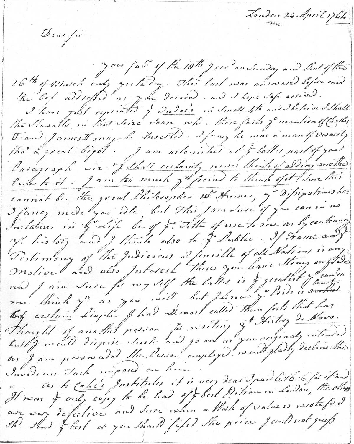 Hume and Millar had shared their historical opinions before. In February and March 1755, Millar had engaged Hume in an extensive discussion over the relative merits of Charles I’s explanations of a royalist commission to Ireland during the Civil War. This correspondence involved Thomas Birch, who politely disagreed with Hume’s faith in Charles’s denials of involvement. See