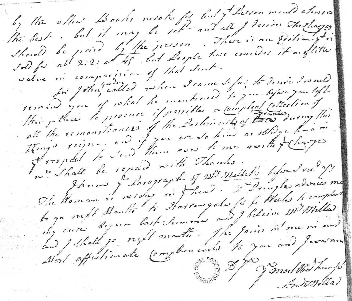 Millar was interrupted in his letter by Sir John Gordon calling and asking him to remind Hume about Gordon’s request for documents from Paris. Millar now tells Hume to send these to his shop, with a note of the associated costs, which Sir John will repay.