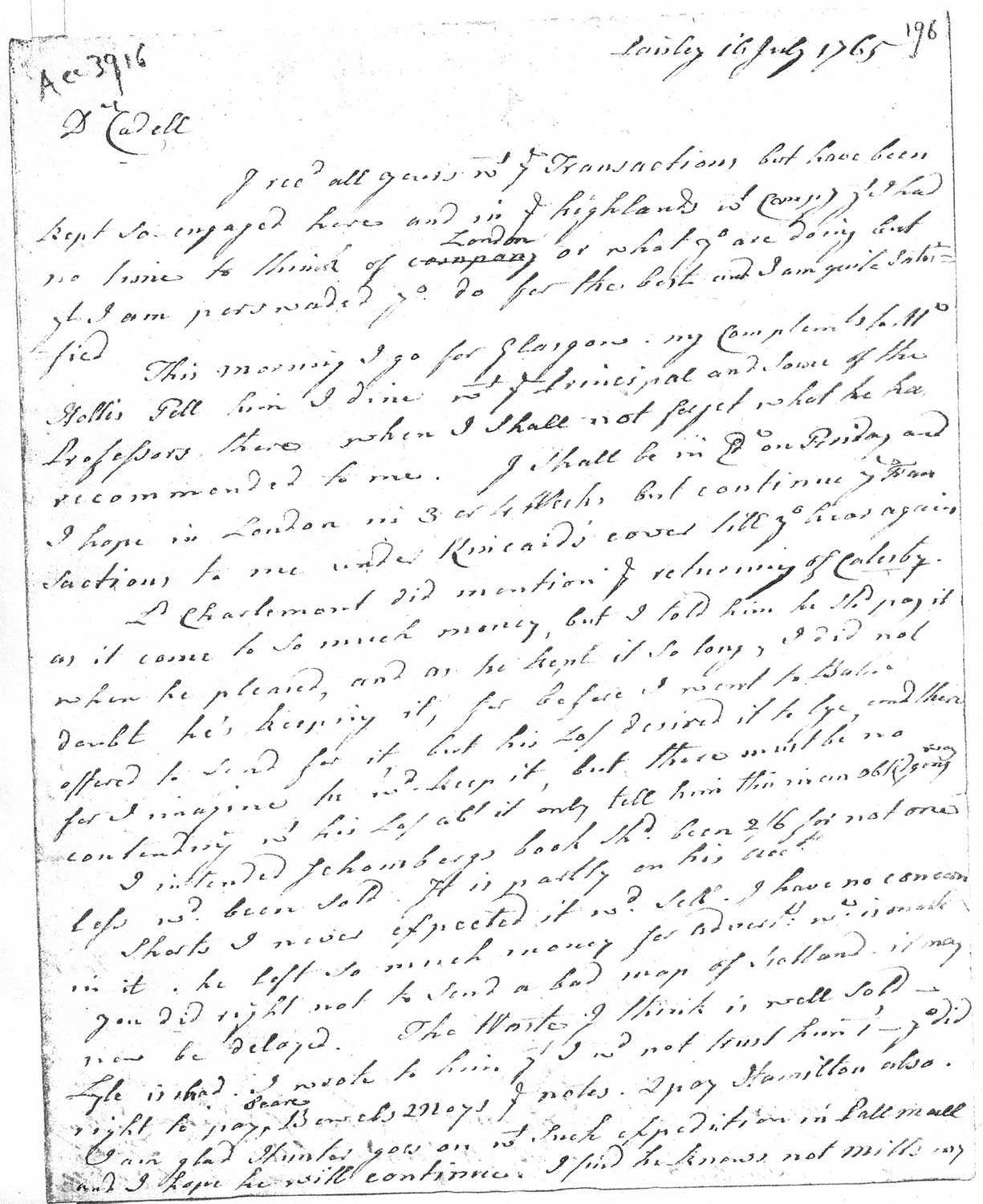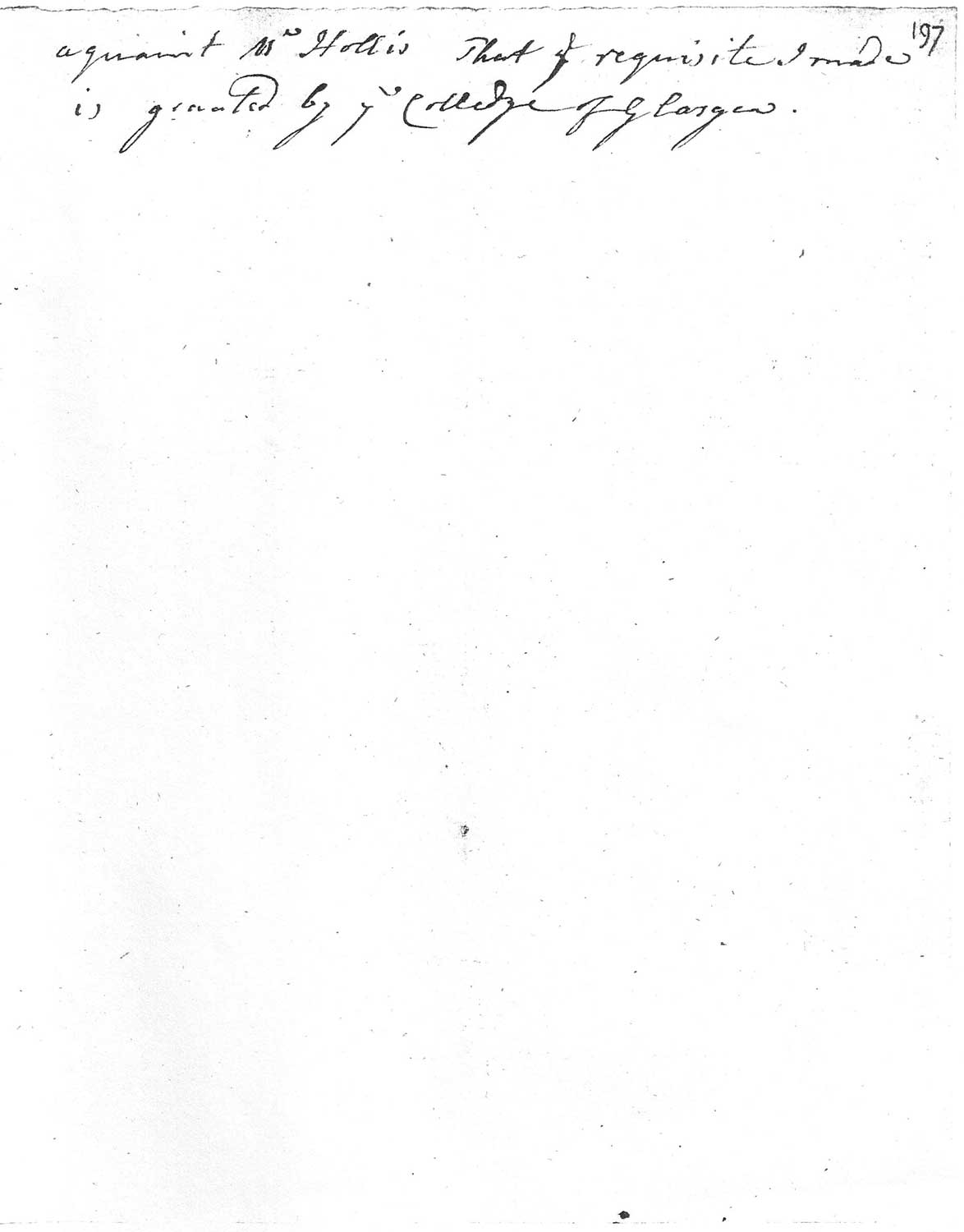 Hollis may have asked Millar to recommend their mutual friend, the English Presbyterian and biographer William Harris (1720–70), for an honorary doctorate from the University of Glasgow. Hollis was told on 20 August 1765 that his recommendation had been approved. Millar’s business and family connections linked Hollis, Harris, and Principal Leechman, while another of Millar’s associates recalled that Hollis’s recommendation to Leechman had been made “by the means of a friend”. See F. Blackburne, Memoirs of Thomas Hollis, Esq. F.R. and A.S.S. (London: [John Nichols], 1780) vol. 1, 273. Harris’s entry in the Oxford DNB does not mention Millar as a probable intermediary.