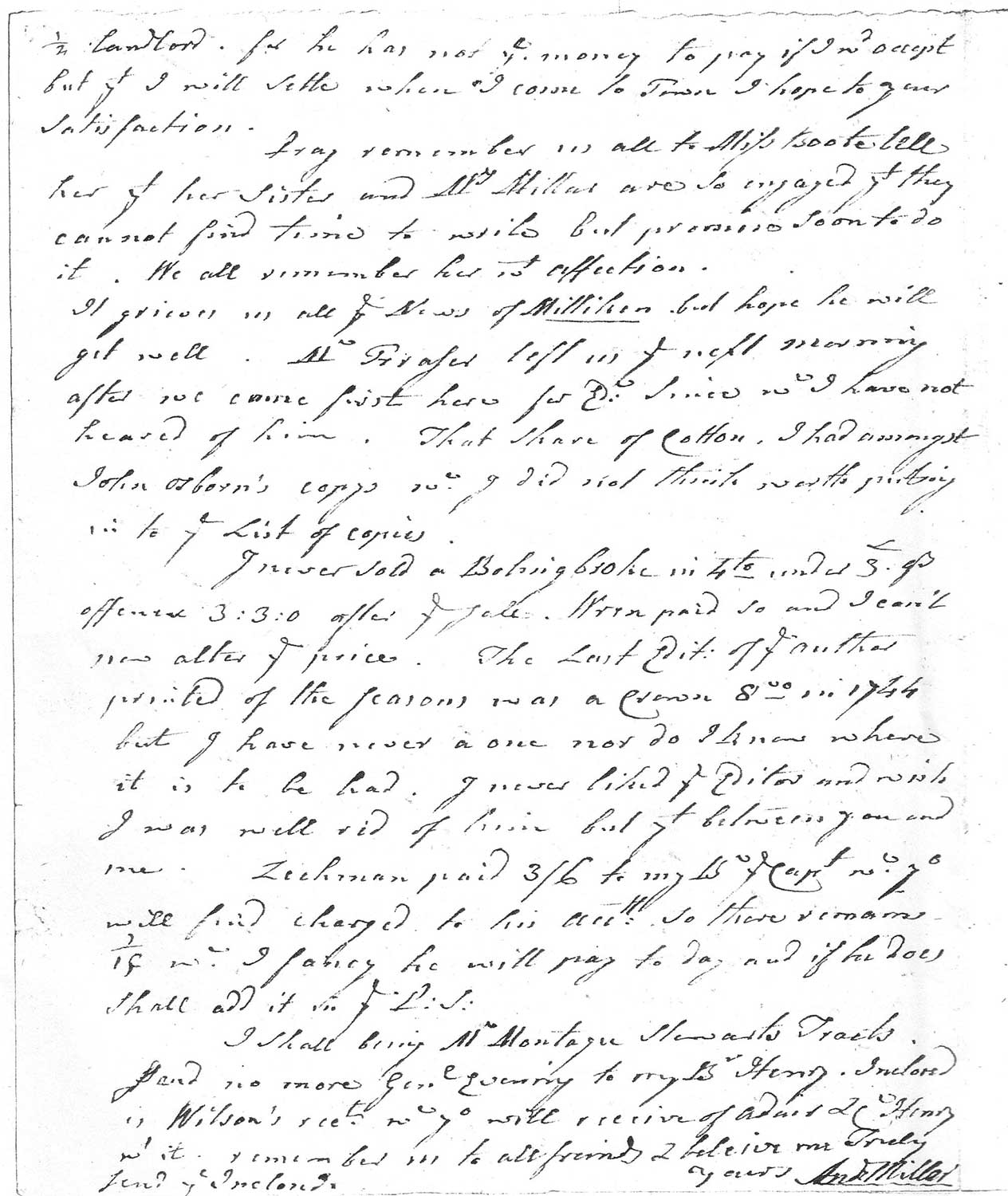 That share of Cotton, I had amongst John Osborn’s copys, i.e., the share of the copyright in Charles Cotton’s Genuine Poetical Works, which I purchased at the sale of John Osborne’s stock and shares. wc I did not think worth printing in to ye List of copies, i.e., which I chose not to include in a printed list of those copies of the book that show my stake in it. Millar is referring to the new, fifth, edition of The Genuine Poetical Works of the Restoration poet Charles Cotton (1630–87), probably in reply to Cadell asking him to confirm his owning a share in its copyright. Millar confirms he acquired copyright through the copies he purchased from John Osborne. Cotton’s poetry remained popular (and therefore lucrative) throughout the eighteenth century, partly due to his clever burlesques of familiar works from classical literature.