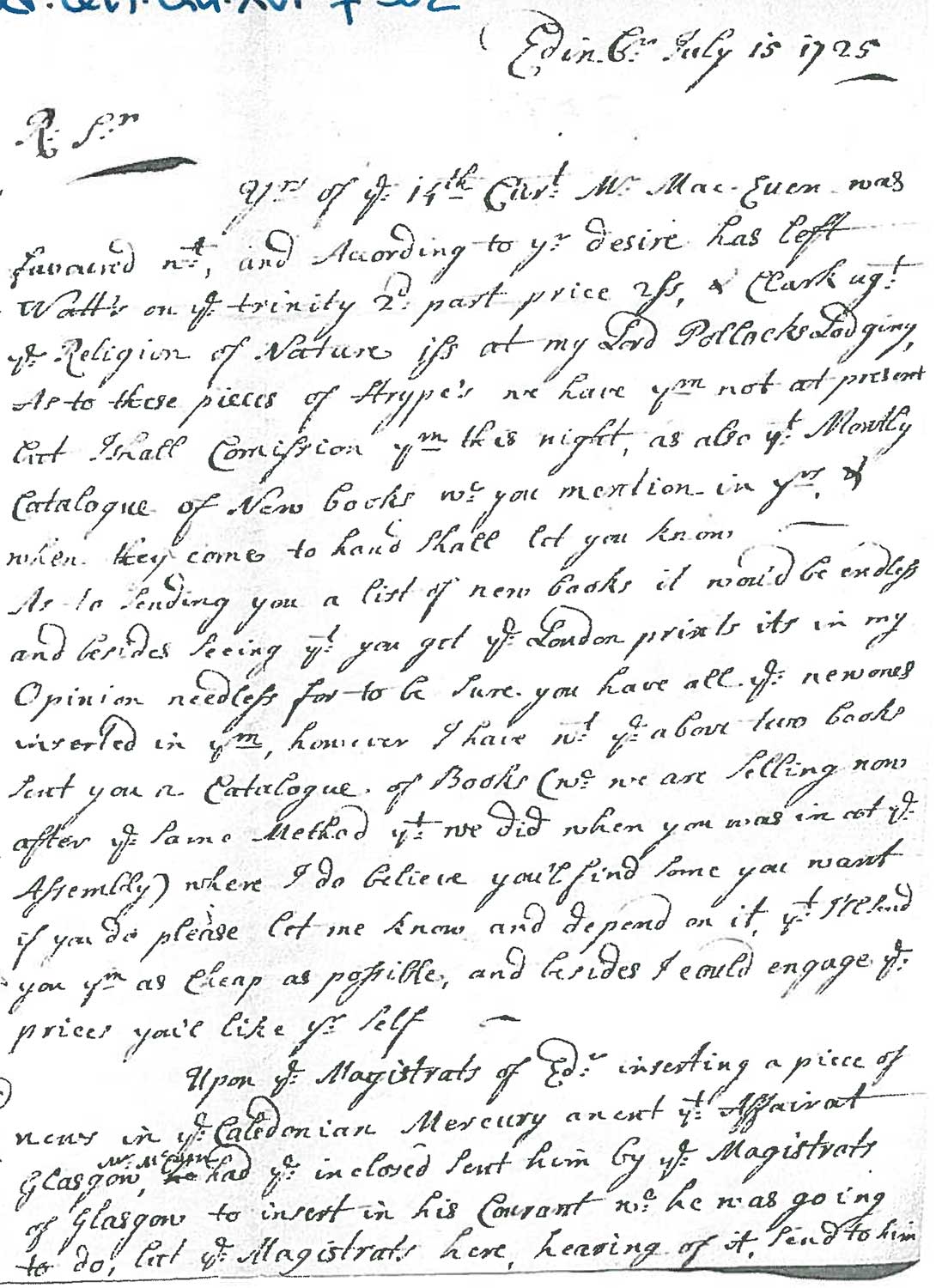 Yrs of ye 14th Curt Mr Mac. Euen was favoured wt,[1] and According to yr desire has left Watt’s on ye trinity 2d part[2] price 2ss, & Clark agt ye Religion of Nature[3] 1ss at my Lord Pollocks Lodging,[4] As to these pieces of Strype’s[5] we have ym not at present but I shall Comission ym this night, as also yt Monthly Catalogue of New books[6] wc you mention in yrs & when they come to hand shall let you know — As to sending you a list of new books it wou’d be endless and besides seeing yt you get ye London prints[7] its in my Opinion needless for to be sure you have all ye new ones inserted in ym, however I have wt ye above two books sent you a Catalogue of Books (wc we are selling now after ye same method yt we did when you was in at ye Assembly)[8] where I do believe you’l find some you want if you do please let me know and depend on it, yt I’ll send you ym as Cheap as possible, and besides I could engage ye prices you’l like yr self.