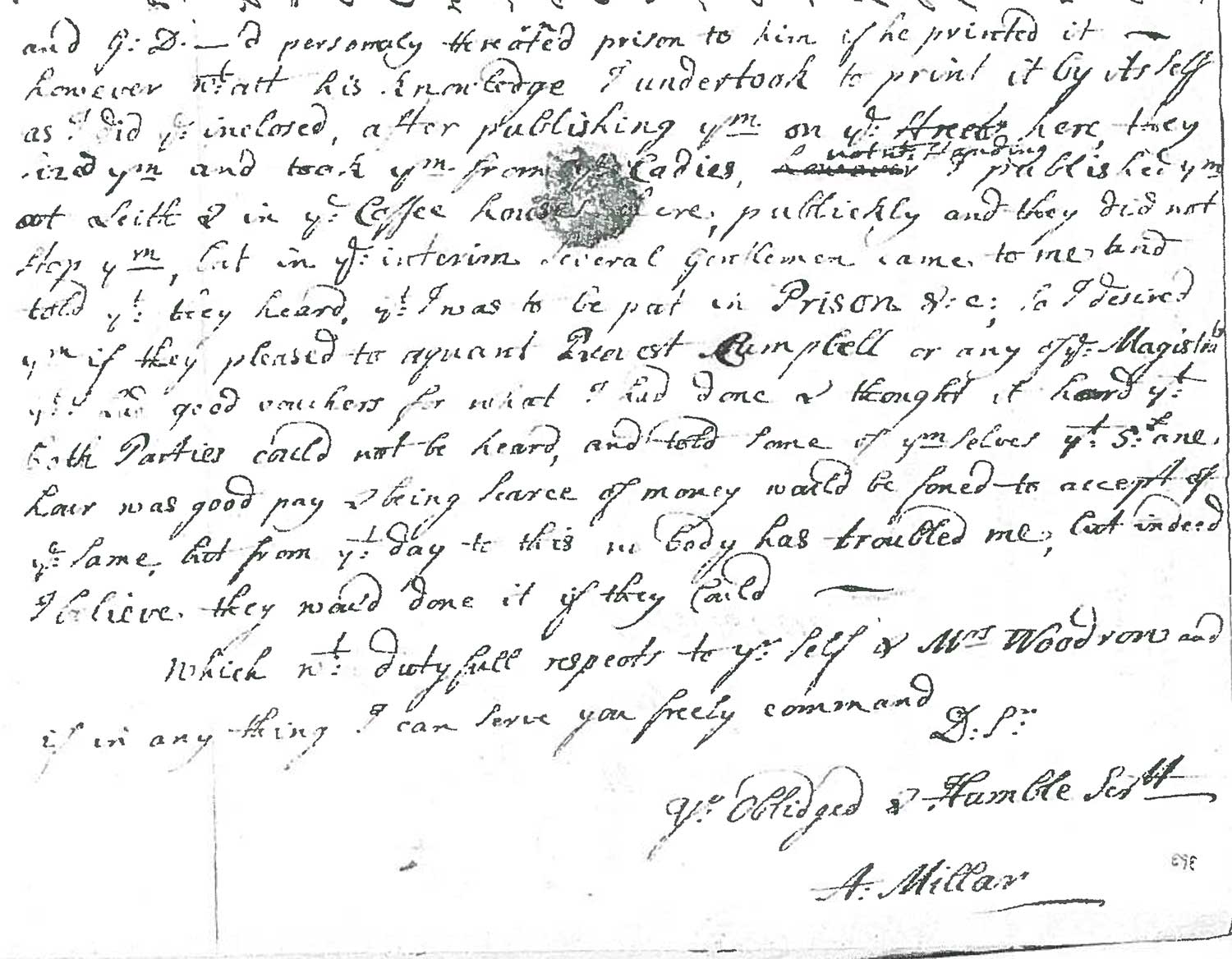 Upon ye Magistrats of Edr[9] inserting a piece of news in ye Caledonian Mercury[10] anent[11] yt Affair at Glasgow,[12] ^Mr McEuen^ he had ye inclosed[13] sent him by ye Magistrats of Glasgow to insert in his Courant[14] wc he was going to do, but ye Magistrats here, hearing of it, send to him page: 2and G: D—d[15] personaly threated prison to him if he printed it[16] — however wtout his knowledge I undertook to print it by itself as I did ye inclosed, after publishing ym on ye Streets here, they [Sized] ym and took ym from ye ladies, however notwtstanding I published ym at Leith[17] & in ye Coffee houses here, publickly and they did not stop ym, but in ye interim several Gentlemen came to me and told yt they heard, yt I was to be put in Prison &:c:, so I desired ym if they pleased to aquant Provost Campbell[18] or any of ye Magistrats yt I had good vouchers for what I had done & thought it hard yt both Parties could not be heard, and told some of ymselves[19] yt 5£ ane hour was good pay & being scarce of money would be [forced] to accept of ye same,[20] but from yt day to this no body has troubled me, but indeed I believe they wou’d done it if they could —