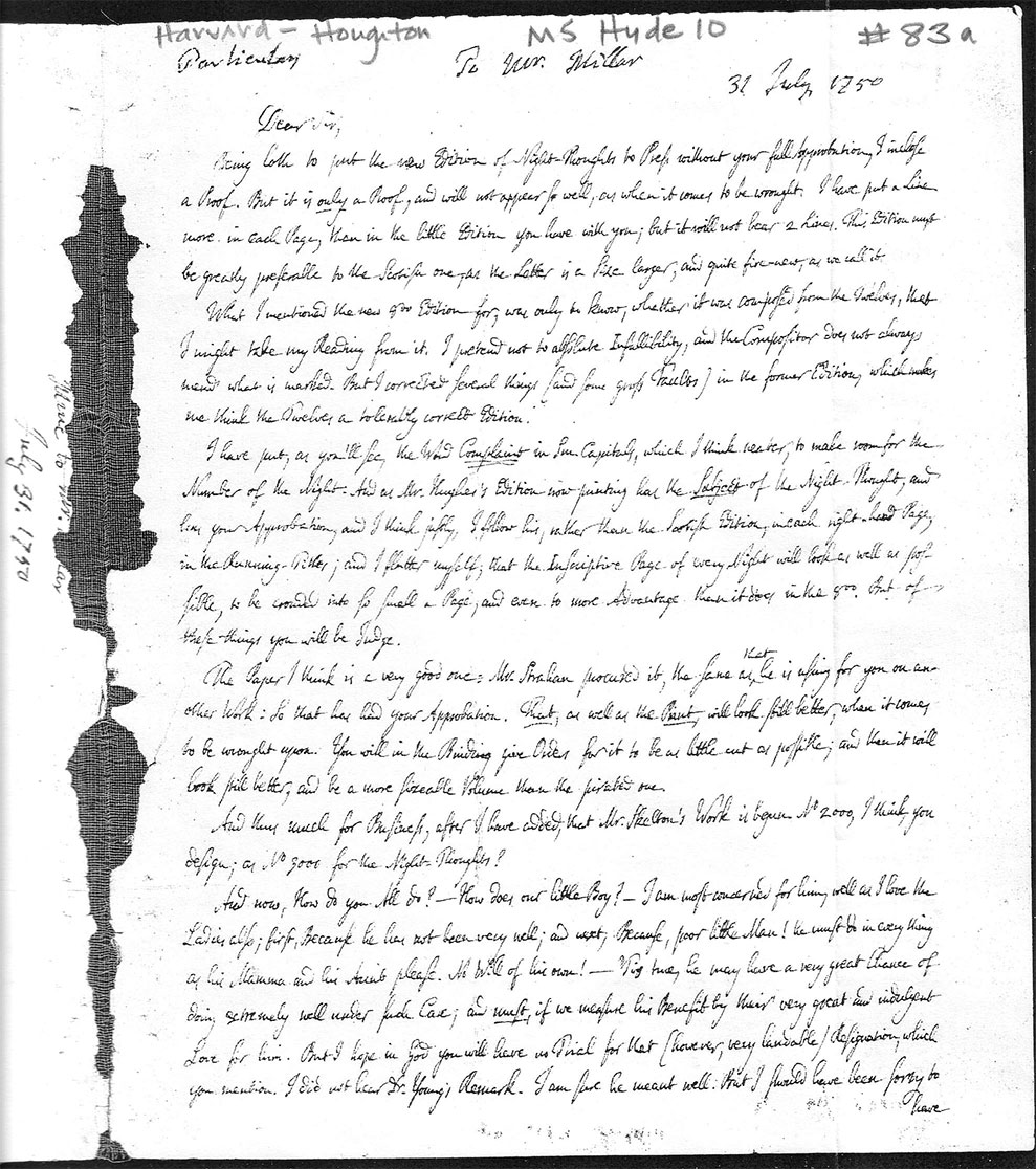 Being loth to put the new Edition of Night-Thoughts to Press without your full Approbation, I inclose a Proof.[2] But it is only a Proof, and will not appear so well, as when it comes to be wrought. I have put a Line more in each Page, than in the little Edition you have with you; but it will not bear 2 Lines. This Edition must be greatly preferable to the Scotish one,[3] as the Latter is a Size larger, and quite fire-new, as we call it.[4]