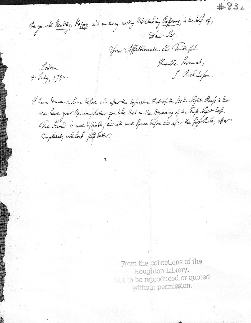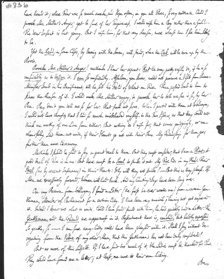 And now, How do you All do?—How does our little Boy?[14]—I am most concerned for him, well as I love the Ladies also;[15] first, Because he has not been very well; and next, Because, poor little Man! he must do in every thing as his Mamma and his Aunt please. No Will of his own!—’Tis true, he may have a very great Chance of doing extremely well under such Care; and must, if we measure his Benefit by their very great and indulgent Love for him. But I hope in God you will have no Trial for that (however, very laudable) Resignation, which you mention. I did not hear Dr. Young’s Remark.[16] I am sure he meant well. But I should have been sorry to havepage: 2 heard it; where Fear was so much awake, and Hope often, in you all Three, so very moderate. Could I provoke Mrs. Millar’s Anger, yet be sure of her Forgiveness, I would wish him a Boy rather than a Girl!—The dear Infant is but young.[17] But I wish him, for that very Reason, more robust than I see him likely to be.