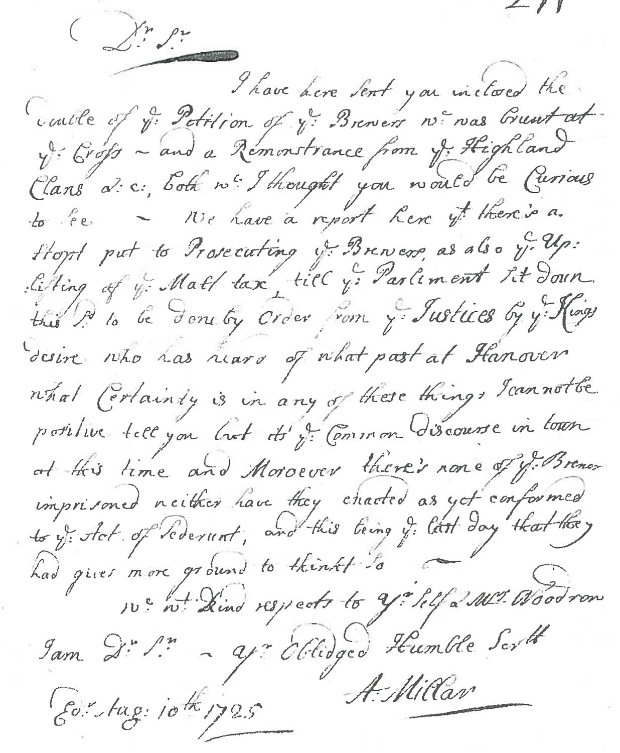 I have here Sent you inclosed the double of ye Petition of ye Brewers[1] wc was brunt at ye Cross[2] – and a Remonstrance from ye Highland Clans &:c:,[3] both wc I thought you would be Curious to See – we have a report here yt there’s a Stopt put to Prosecuting ye Brewers, as also ye Uplifting of ye Malt tax, till ye Parliment sit doun[4] this sd to be done by Order from ye Justices by ye Kings desire who has heard of what past at Hanover[5] what Certainty is in any of these things I can not be positive till you but it’s ye Common discourse in town at this time and Moroever there’s none of ye Brewer[s] imprisoned neither have they enacted as yet conformed to ye stat. of Sederunt,[6] and this being ye last day that they had gives more ground to thinkt so. —